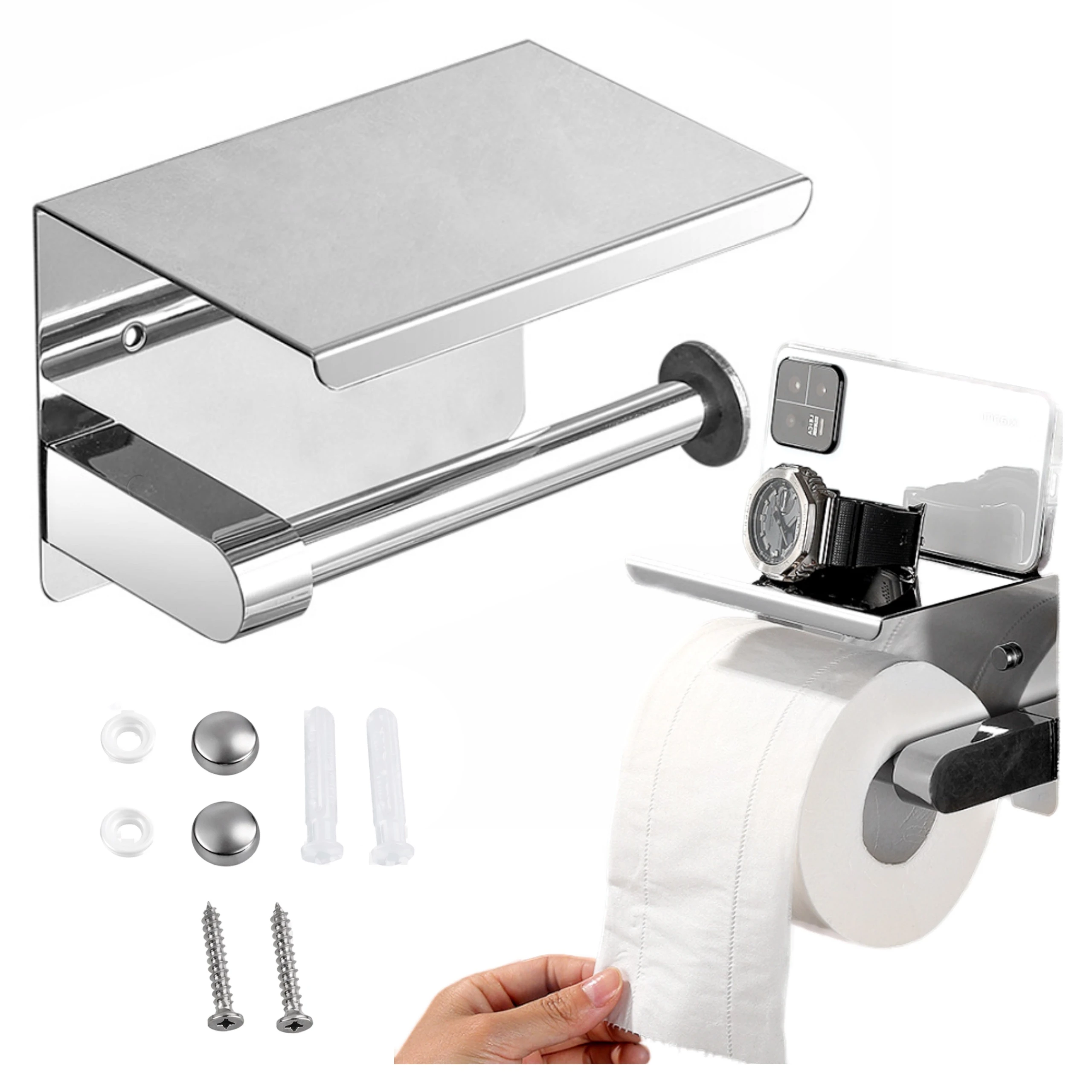 Uchwyt na papier toaletowy z półką łączy dwie przydatne funkcje w jednej konstrukcji. Górna półka sprawdza się jako miejsce na telefon, chusteczki lub inne drobne akcesoria łazienkowe.