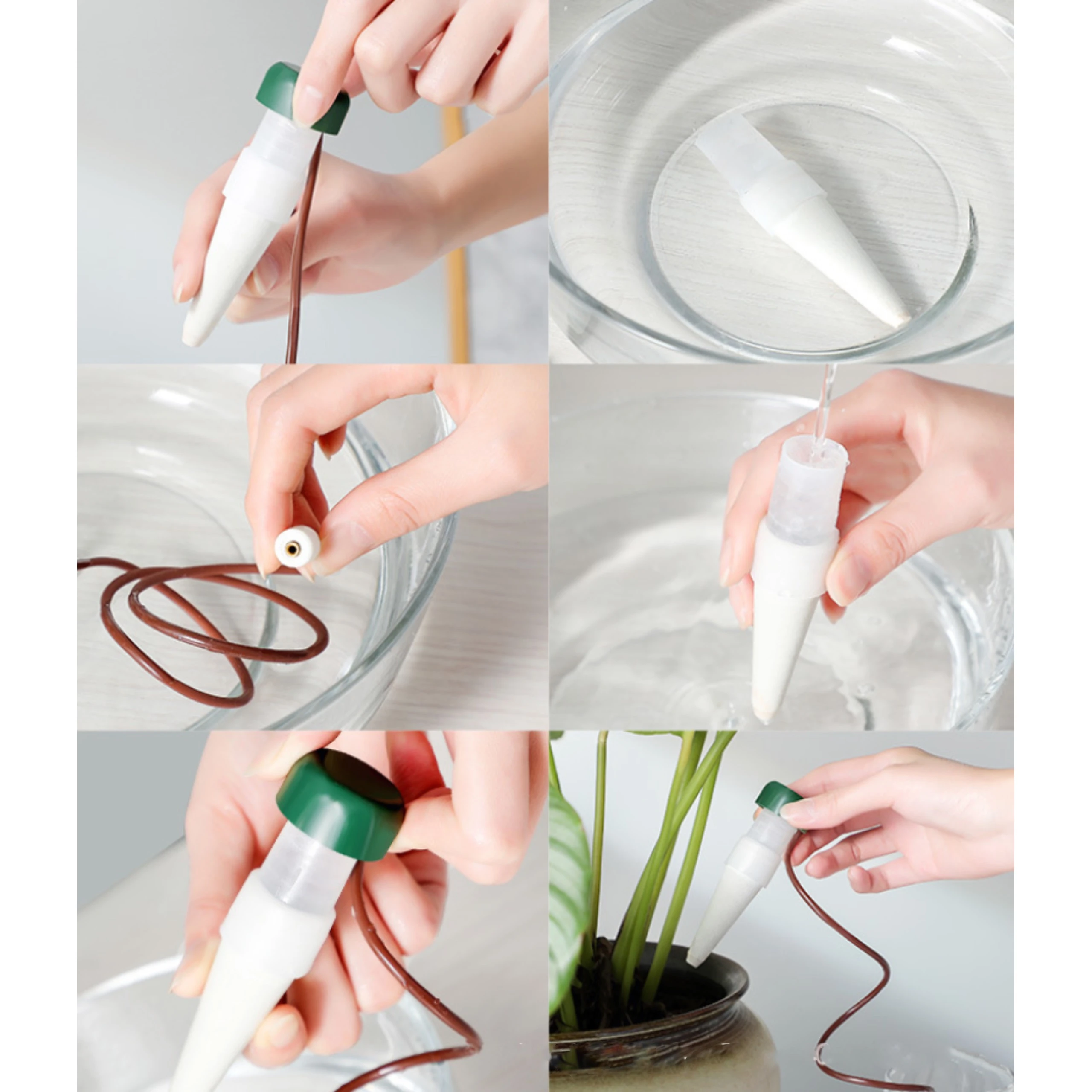 Montaż jest intuicyjny i nie wymaga dodatkowych narzędzi. Ceramiczny stożek należy umieścić w glebie, a wężyk podłączyć do zbiornika z wodą.