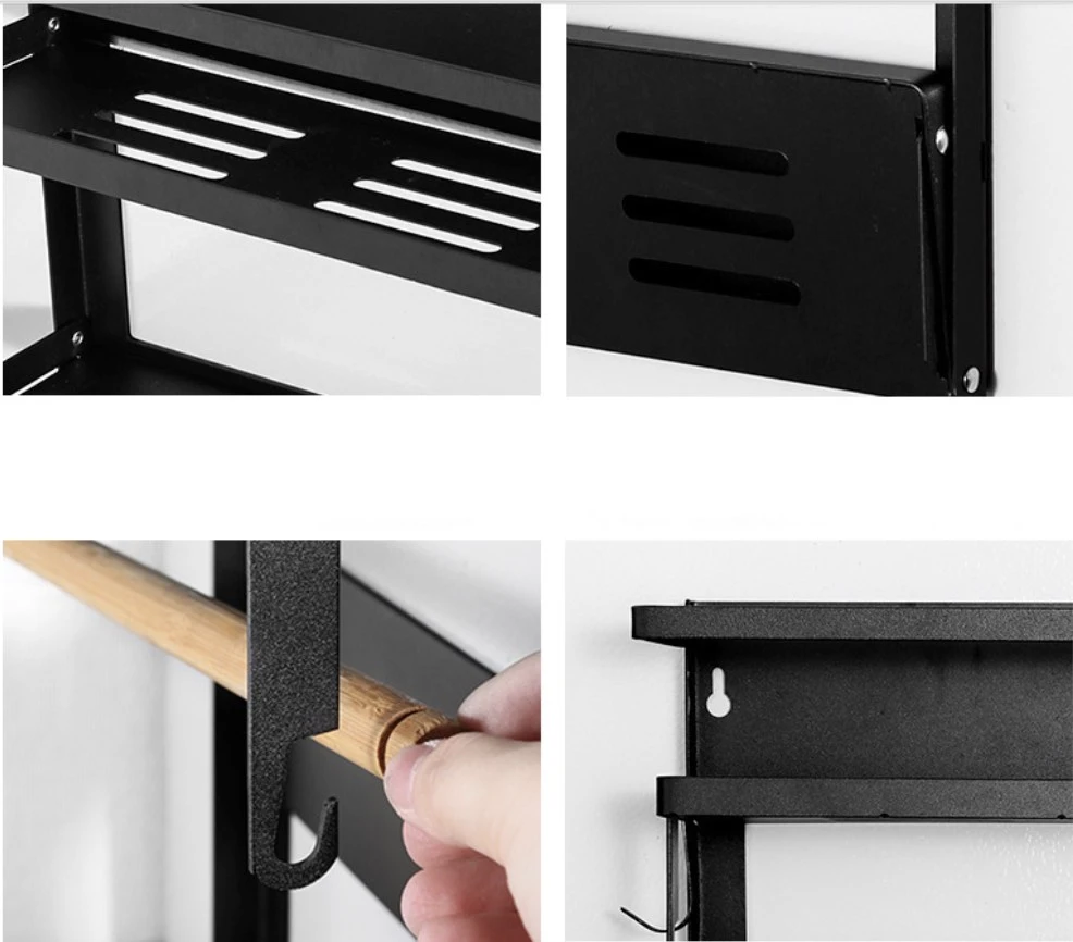 Dzięki półkom, wieszakom i drewnianym drążkom, organizer jest idealny do przechowywania przypraw, akcesoriów kuchennych, ręczników papierowych i innych niezbędnych przedmiotów.