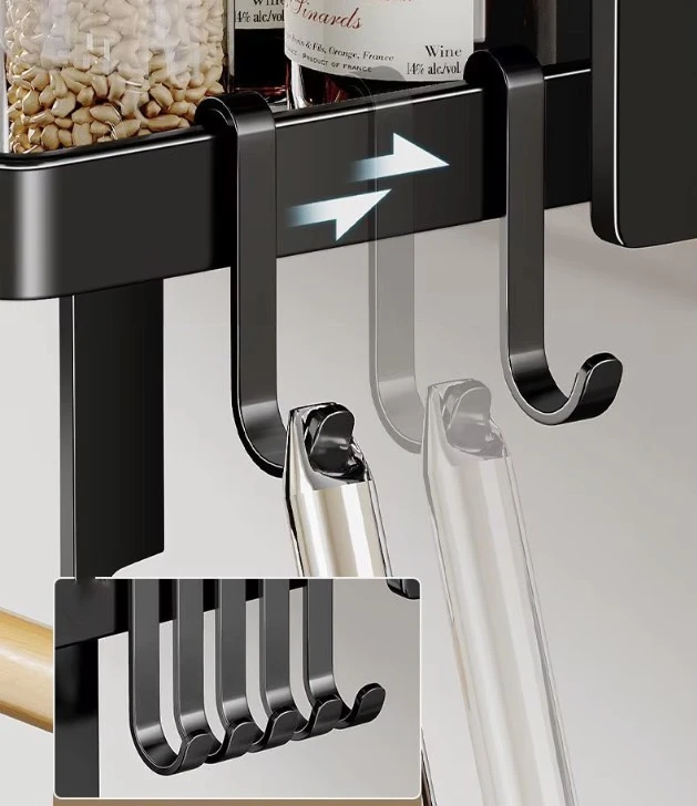 Cztery metalowe haczyki umieszczone na dole organizera doskonale sprawdzą się do zawieszania przyborów kuchennych, takich jak chochle, łopatki czy otwieracze.