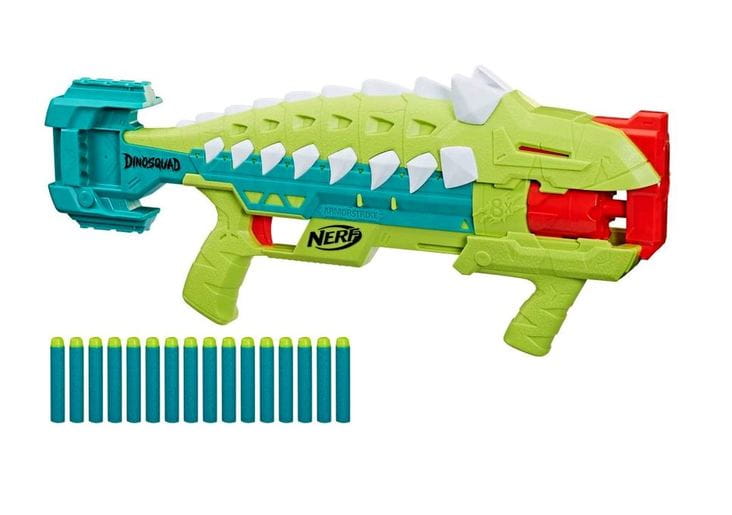 Ruszaj do akcji z blasterem DinoSquad Armorstrike, którego kształt i kolorystyka zostały zainspirowane wyglądem dinozaura Ankylozaura. Jaszczurcza prezencja i drapieżne kolory odstraszą podczas bitwy NERF niejednego przeciwnika.