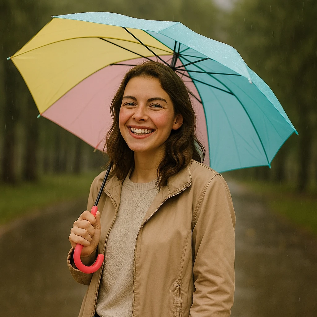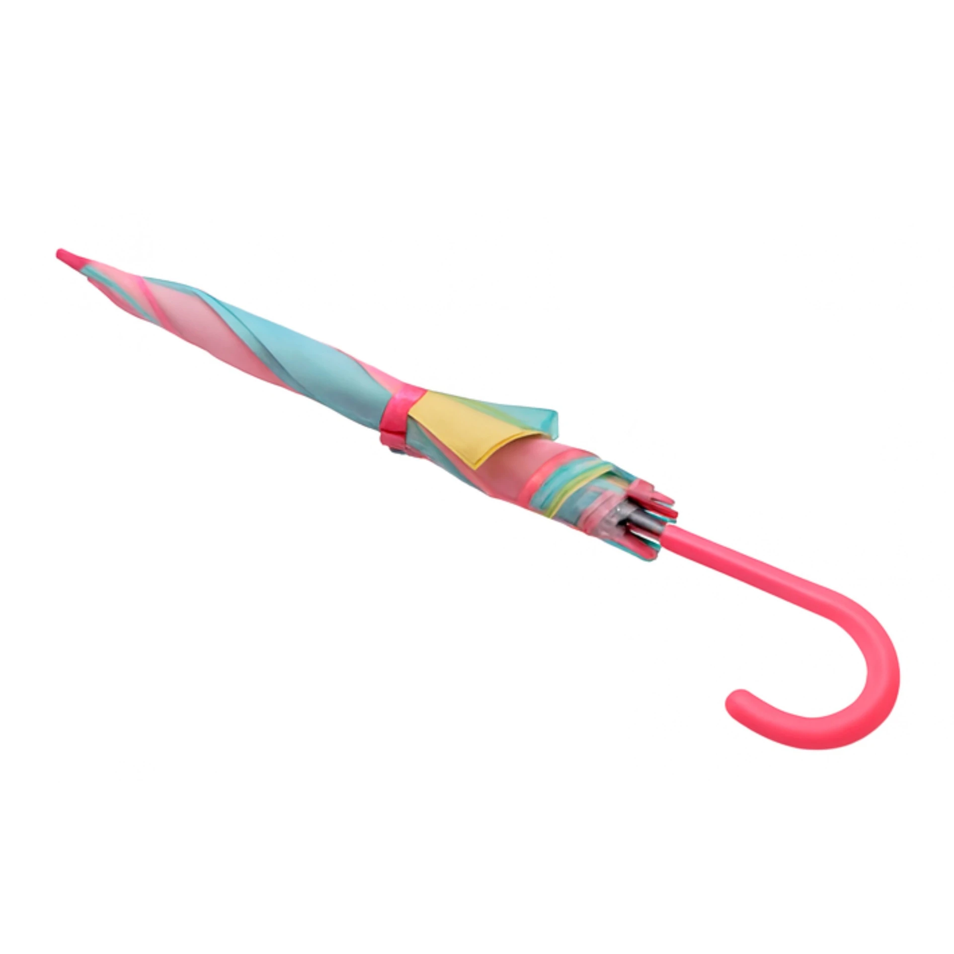 Parasol w odcieniach pastelowej tęczy to praktyczne i estetyczne rozwiązanie na deszczowe dni.