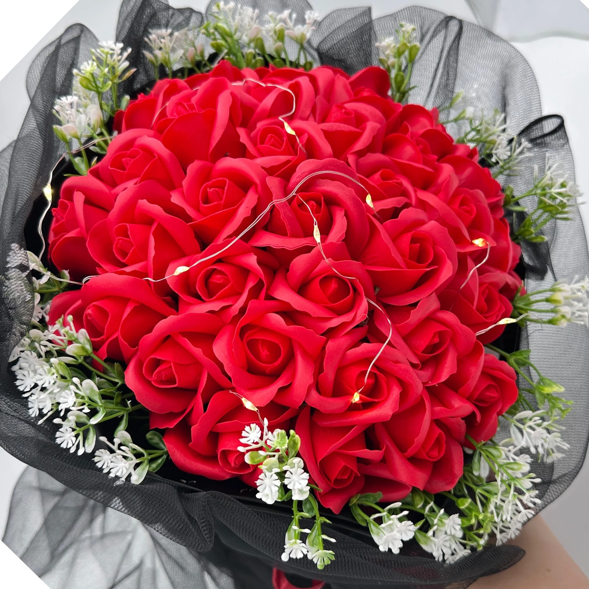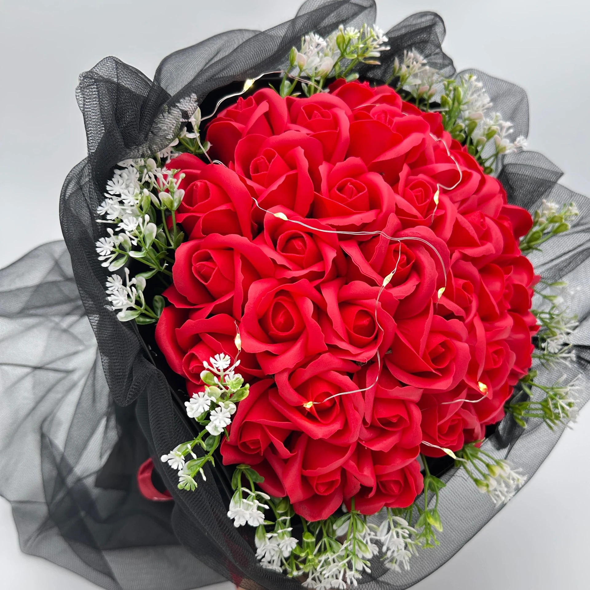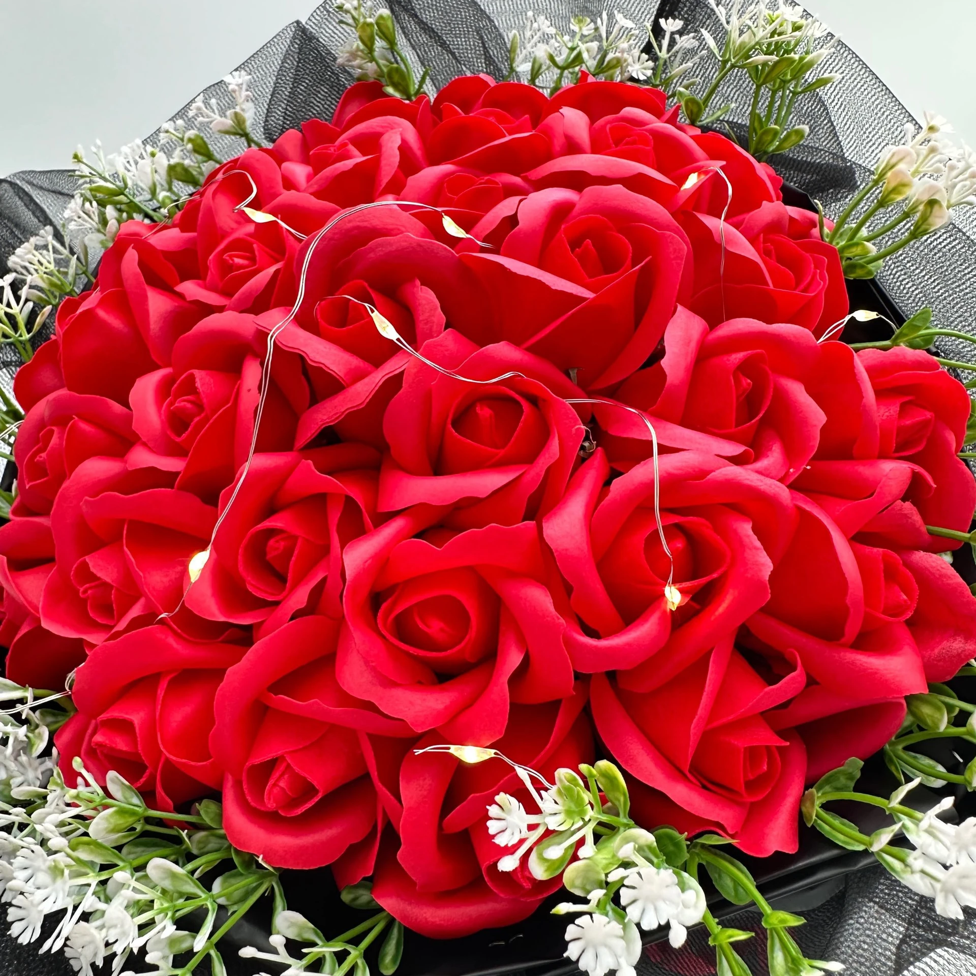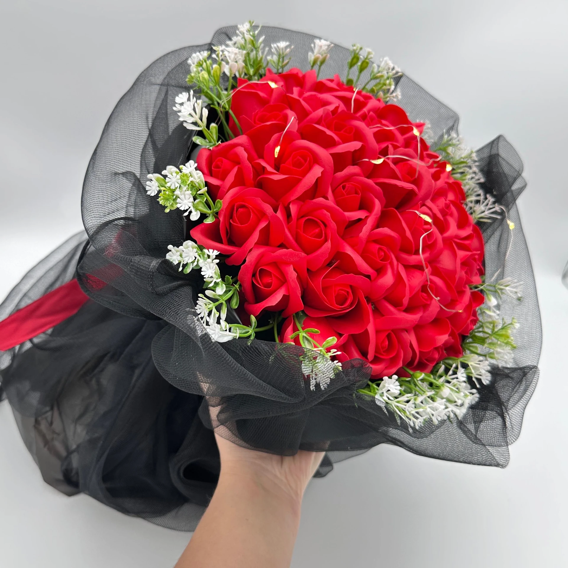 Bukiet czerwonych róż z płatków mydlanych z led czarny tiulem na prezent 33 róże dzień kobiet prezent dla niej