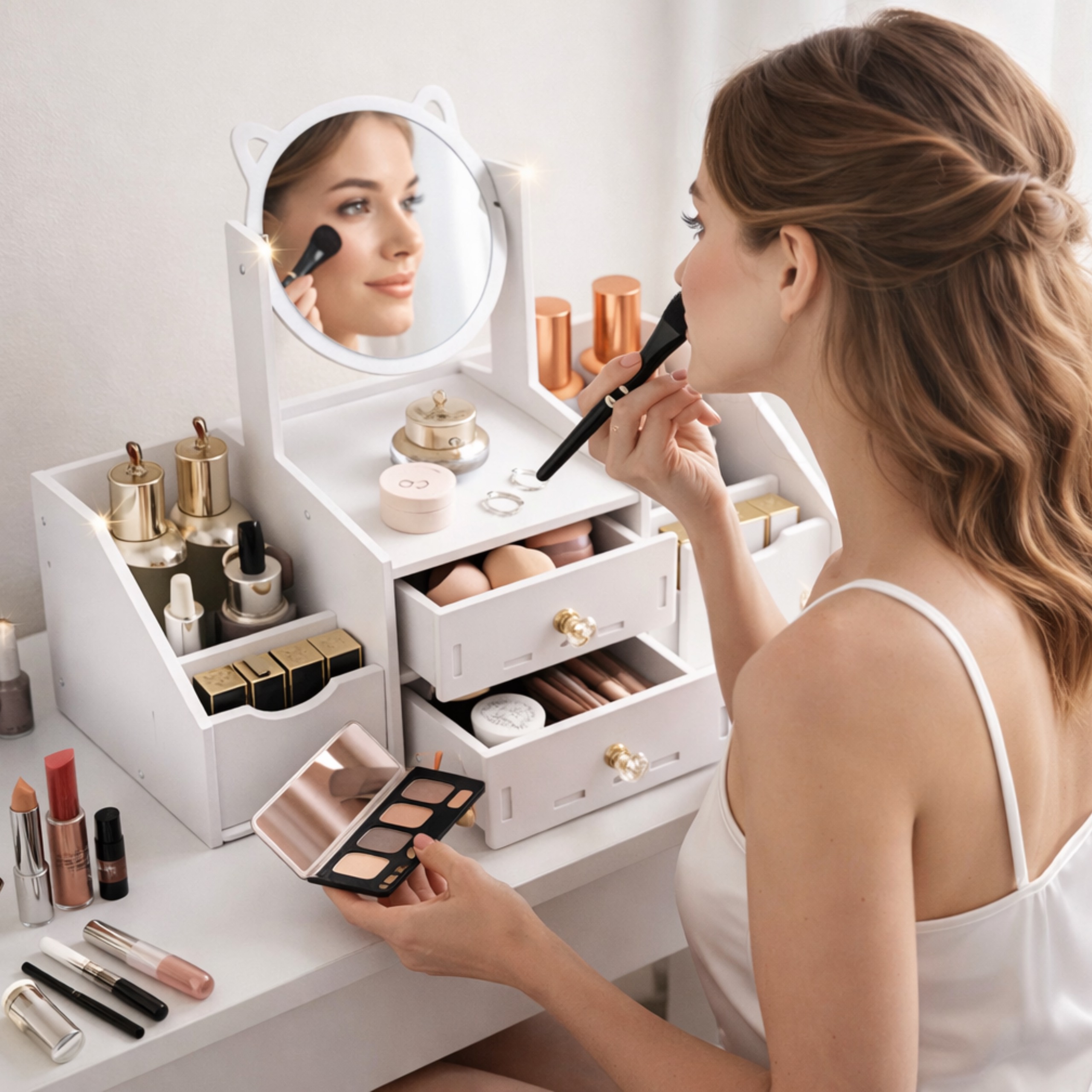 ✅ Lustro z kocimi uszami – nadaje toaletce uroku i jest idealne do codziennego przeglądania się i robienia makijażu,