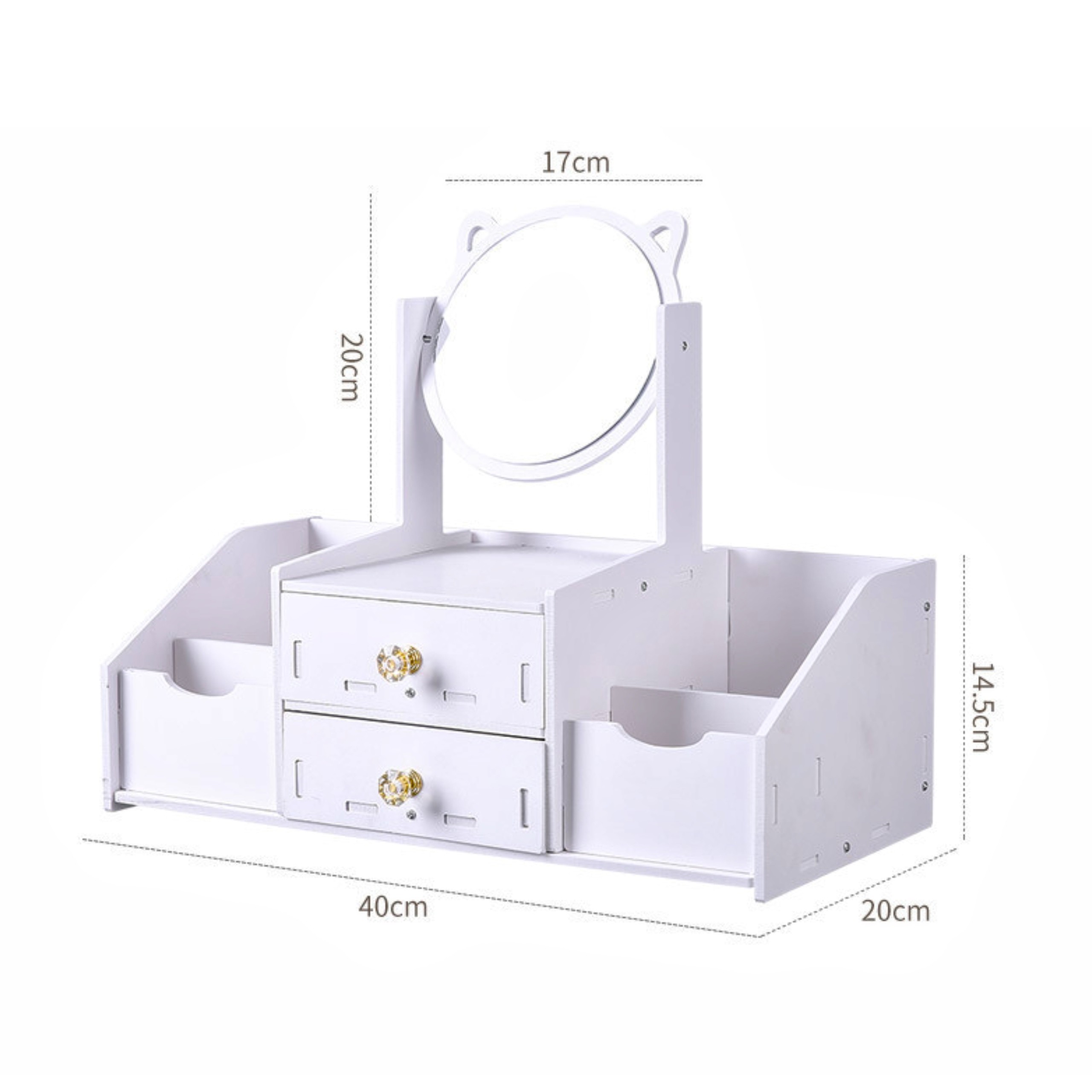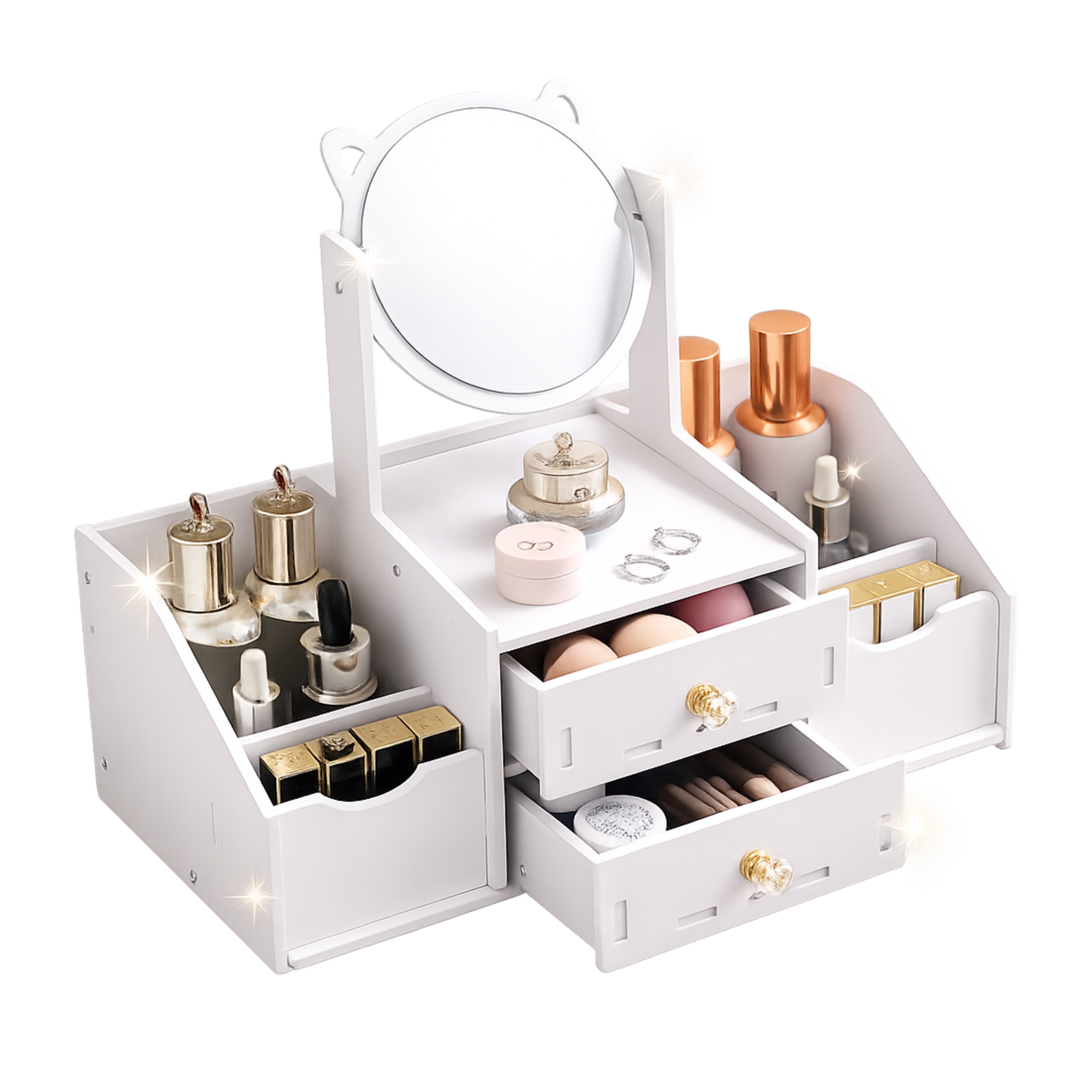 ✅ Szuflady idealnie nadają się na biżuterię, kosmetyki kolorowe i drobiazgi, a boczne przegródki pomieszczą większe produkty jak kremy, perfumy czy pędzle.
